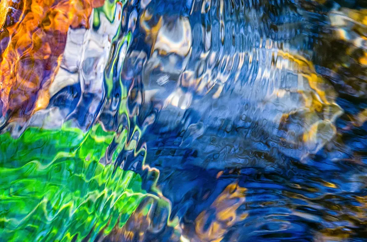 Riverberi luminosi, bagliori nell’acqua, effetti di rifrazione e iridescenza, con forti contrasti cromatici, segni grafici come costruzione dello spazio.